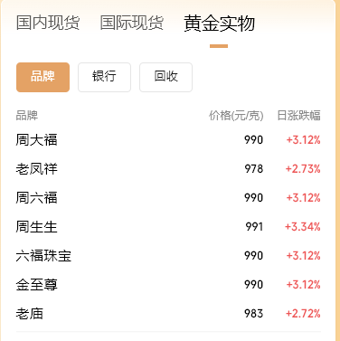 这也带动国内金饰价格一路飙升。银柿财经查询发现,11日多家知名品牌的金饰价格已达到990元/克左右,周六福足金999.9价格更是涨到1010元/克。