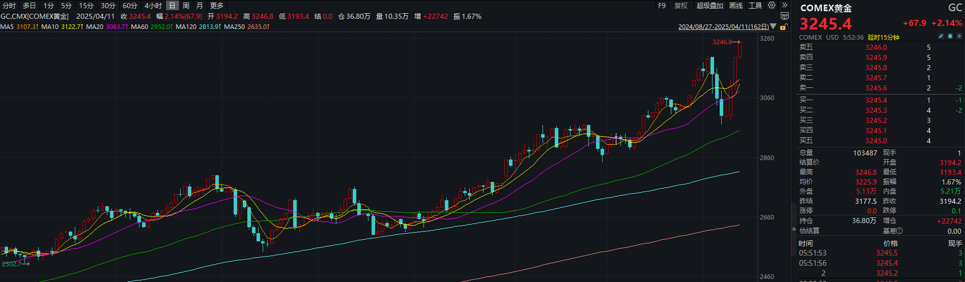 4月11日,COMEX黄金价格一路上涨,突破3200美元/盎司,盘中一度涨至3246.8美元/盎司,而这距离其3月31日首次突破3100美元/盎司仅过去了11天。