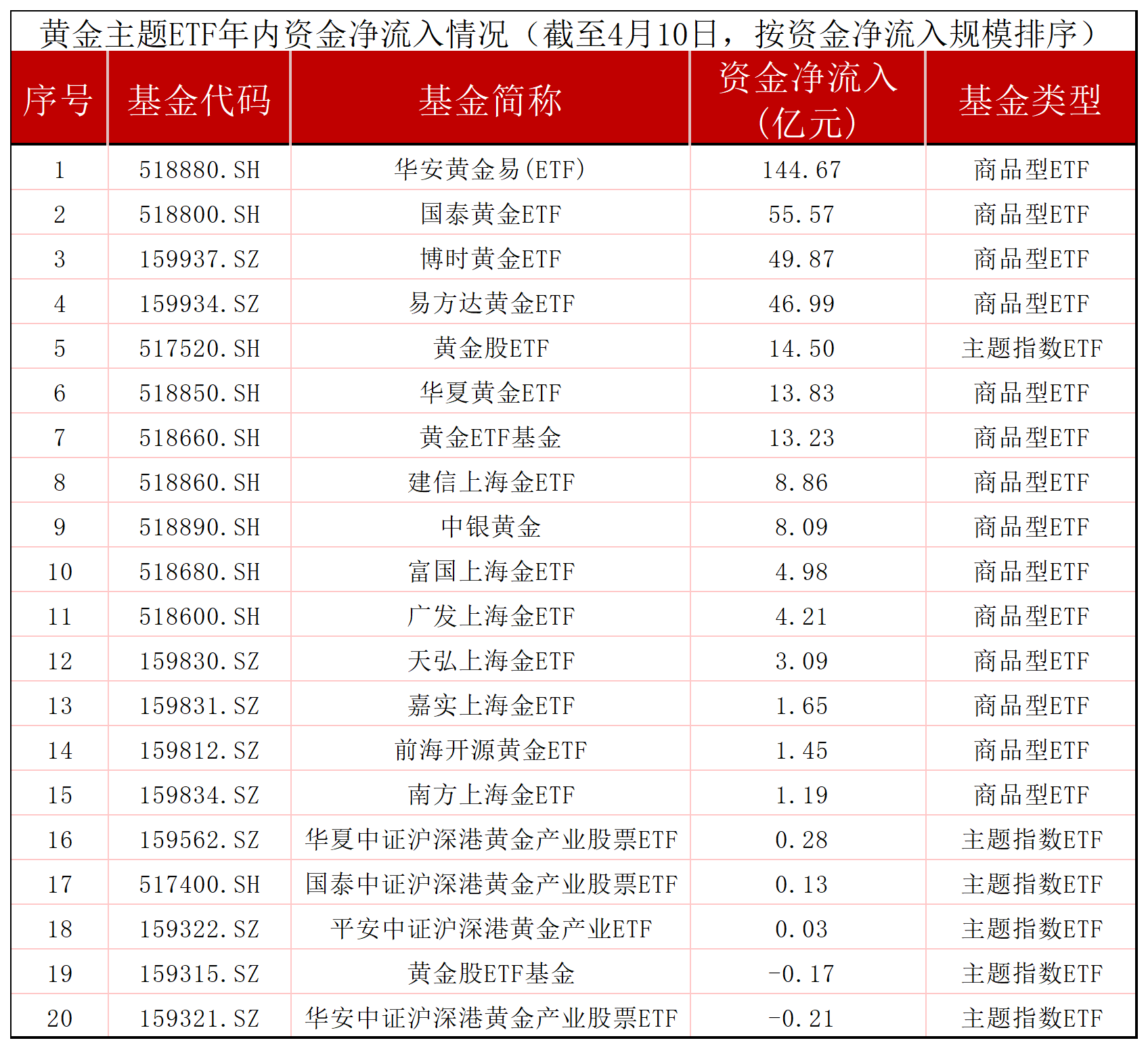 同花顺iFinD数据显示,目前场内有6只与中证沪港深黄金产业股票指数挂钩的黄金股ETF,还有14只黄金主题的商品型ETF(以下统称为黄金主题ETF)。截至4月10日,共有18只黄金主题ETF年内获得资金净流入,合计净流入资金达372.62亿元。