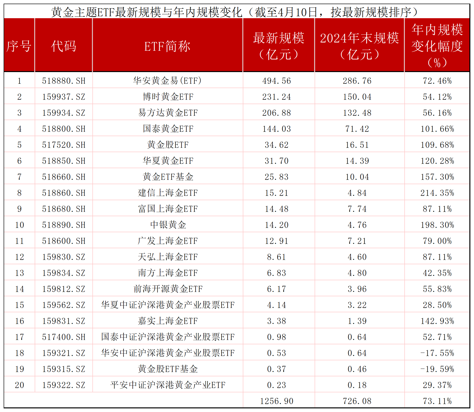 截至4月10日,这20只黄金主题ETF总规模较2024年年末增加了530.82亿元,涨幅达73.11%。其中建信上海金ETF规模增长超200%,国泰黄金ETF、永赢黄金股ETF、华夏黄金ETF、中银黄金ETF、嘉实上海金ETF5只产品年内规模已经翻了一番。