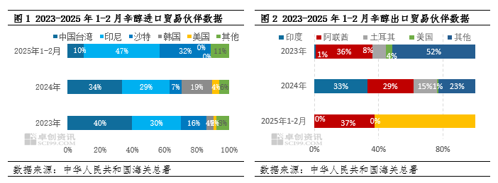 对于辛醇行业本身而言,一方面,国内辛醇虽然近年来对外出口量稳中有增,但对美国出口量占比相对较小,对于总体辛醇出口影响较为有限;另一方面,近年来辛醇对外进口依赖逐年下降,同时来自美国的辛醇进口量占比呈现更为显著下降趋势,占国内辛醇总进口量比例则相对较小,虽然关税实施或可能造成辛醇进出口成本增加,但实际对辛醇外贸总体体量影响微弱。实际数据来看,2024年全年,国内辛醇总进口量33.68万吨,其中来自美国辛醇进口量1.5万吨,占比仅为4.45%;2025年1-2月共进口辛醇5.14万吨,来自美国辛醇进口量仅为0.000001万吨,表明该部分进口量基本处于逐渐退出状态。2024年全年,国内辛醇总出口量达到8.86万吨,其中出口至美国辛醇共计0.11万吨,占比仅为1.2%;2025年1-2月辛醇总出口量0.77万吨,出口至美国仅为0.0076万吨。因此,辛醇中美之间外贸数量占总体外贸量比例微小,本次关税无论落地与否,对辛醇产品自身影响较为有限。