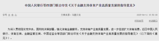 为强化体育金融服务,支持体育产业高质量发展,进一步促进扩大体育消费,中国人民银行等四部门联合印发《关于金融支持体育产业高质量发展的指导意见》(下称《意见》)。