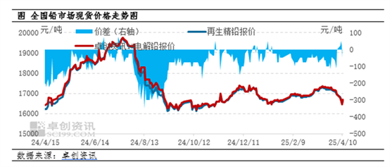 本周再生精铅价格重心下移。截至2025/4/10,卓创资讯全国再生精铅含税主流出厂价格16575—16625元/吨,均价16600元/吨,较上周四跌300元/吨,跌幅1.77%;较去年同期涨450元/吨,涨幅2.78%;今年累计跌75元/吨,跌幅0.45%。本周均价16650元/吨,较前一周均价跌408.5元/吨,跌幅2.39%。