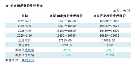 本周(2025/4/4-4/10)现货1#电解铅价格先跌后涨,价格重心跌幅1.47%。截至2025/4/10,卓创资讯现货1#电解铅报价16650—16750元/吨,均价16700元/吨,较上周四跌250元/吨,跌幅1.47%;较去年同期涨350元/吨,涨幅2.14%;今年累计跌50元/吨,跌幅0.30%。本周均价16637.5元/吨,较前一周均价跌477.5元/吨,跌幅2.79%。本周宏观消息博弈,导致有色市场集体回落,需求端受行情反复影响,多观望,成交情况一般,现货铅价格重心下移。