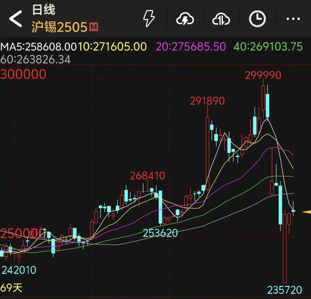 截至4月11日下午收盘,沪锡主力2505合约报收257450元/吨,涨幅3.62%。夜盘时段,沪锡2505合约继续反弹,盘中涨逾2%,最高升至261380元/吨。