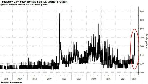 另一重美债收益率曲线长期流动性下降的信号是:本周基准30年期美债的买卖价差几乎达到了整整一个基点,这是自2023年初以来从未见过的水平。