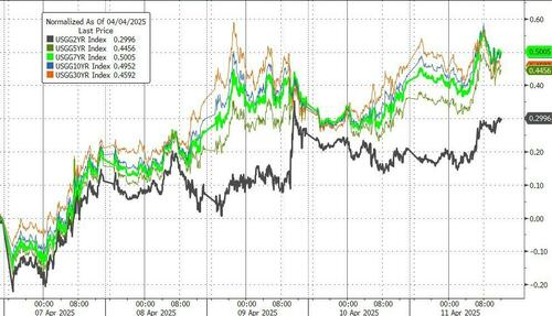 特朗普反复无常的关税政策引发投资者对美国资产的大幅撤离。本周,美债市场遭遇了史诗级抛售,10年期美债收益率上涨了近50个基点,创下2001年以来的最大涨幅;30年期美债收益率本周更是上涨44个基点,表明市场对长期债券的需求急剧下滑。