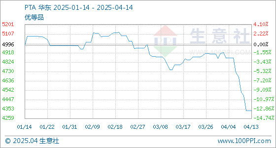 4月14日,生意社PTA基准价为4338.12元/吨,与本月初(4861.60元/吨)相比,下降了-10.77%。