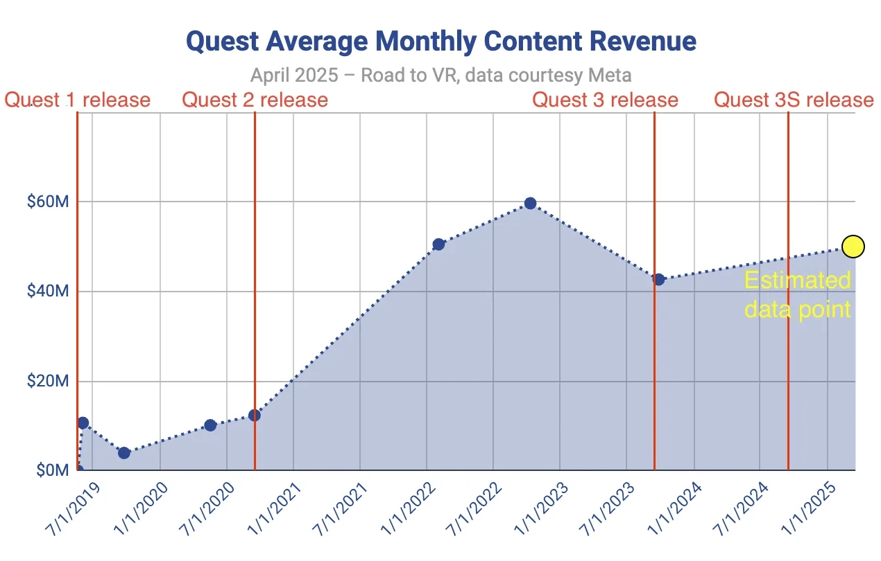 据悉,Meta 最早在 2023 年 9 月便透露 Quest 商店总收入达到 20 亿美元,由此可以合理推测,Quest 平台上内容的总收入至 2025 年 3 月可能略低于 30 亿美元(现汇率约合 218.91 亿元人民币)。如果这个推测成立,那么在 Quest 2 时代实现显著增长后,Quest 3 及 Quest 3S 时代的收入增长基本进入了平台扩展的瓶颈期。