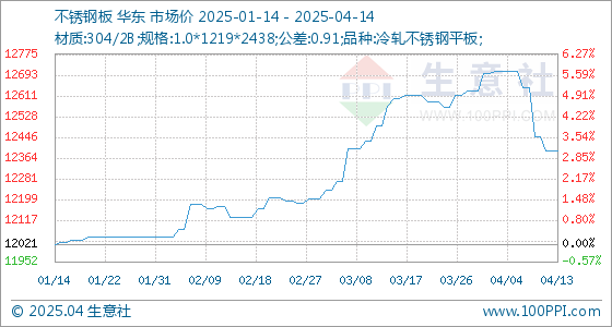 4月14日,生意社不锈钢板基准价为12392.86元/吨,与本月初(12700.00元/吨)相比,下降了-2.42%。