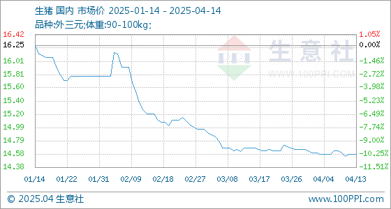 4月14日,生意社生猪基准价为14.58元/公斤,与本月初(14.62元/公斤)相比,下降了-0.27%。