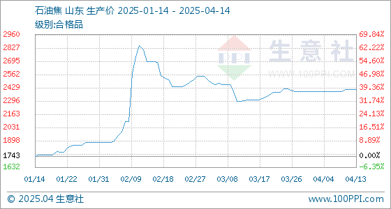 4月14日,生意社石油焦基准价为2412.50元/吨,与本月初(2387.50元/吨)相比,上涨了1.05%。