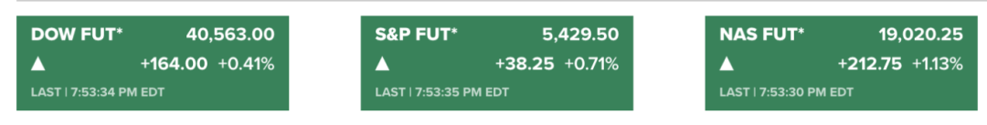 此外,美股主要股指期货亦走高,截至发稿,道指期货涨0.41%,标普500指数期货涨0.71%,纳指期货涨超1%。