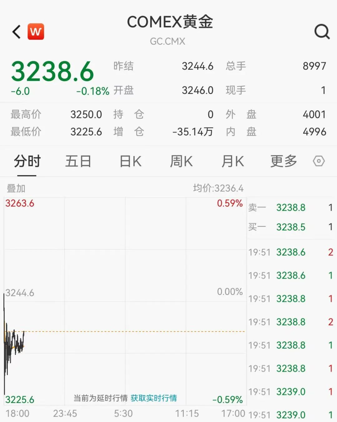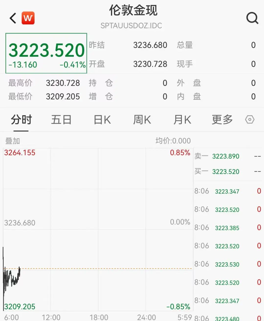 黄金期现价格短线走低,截至发稿,COMEX黄金跌0.18%,盘初一度跌约0.6%;伦敦金现跌0.41%。上周,国际金价再创历史新高,伦敦金现一度冲高至3245.45美元/盎司。