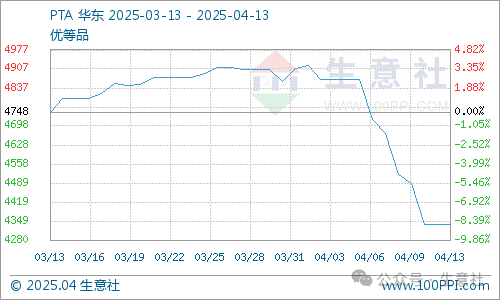 据生意社商品行情分析系统,上周国内PTA现货市场行情呈现弱势,截止4月13日华东地区市场均价在4338元/吨,较上周初下跌8.14%。