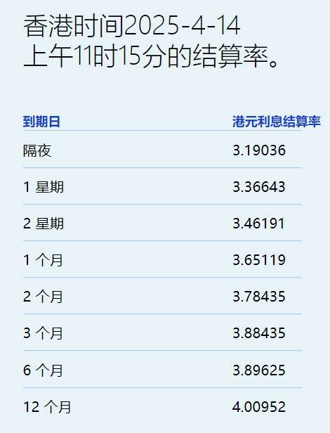 4月14日,港元拆息亦全线上升。隔夜息回升约6基点至3.19036%,而与楼按相关的一个月拆息连升三天,今报3.65119%,齐创两周新高。反映银行资金成本的三个月拆息升至3.88435%,为3月27日以来最高,六个月升至3.89625%,一年期触4%,报4.00952%。