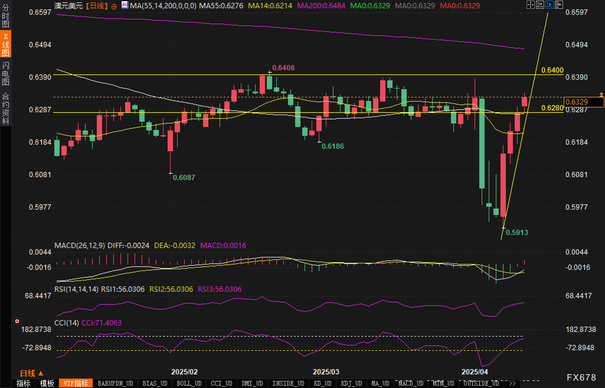 然而,中期来看,澳元上行空间可能受限。首先,全球贸易紧张关系并未从根本上缓解,市场情绪仍然脆弱;其次,美国通胀虽有所缓和但仍高于美联储2%的目标,美联储可能不会过早大幅降息。技术上,日线图的MA200位于0.6484构成较强阻力,突破难度较大。若汇价无法有效突破0.6400-0.6450区间,不排除形成双顶形态风险,届时汇价可能回落至0.6200-0.6250支撑区间。
