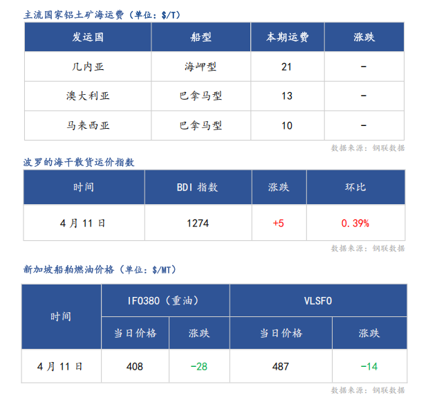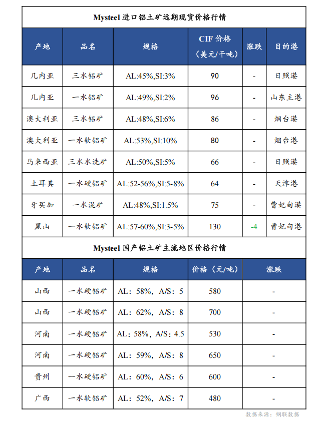 4月14日进口矿价格与上周持稳,几内亚某港口暂停还未结束,供应端有小幅收缩。另外矿山现货价格保持相对坚挺,除氧化铝厂港口库存外暂无低价报盘,氧化铝厂受到亏损压力保持长单保供低库存运行,对进口矿需求维持低迷。