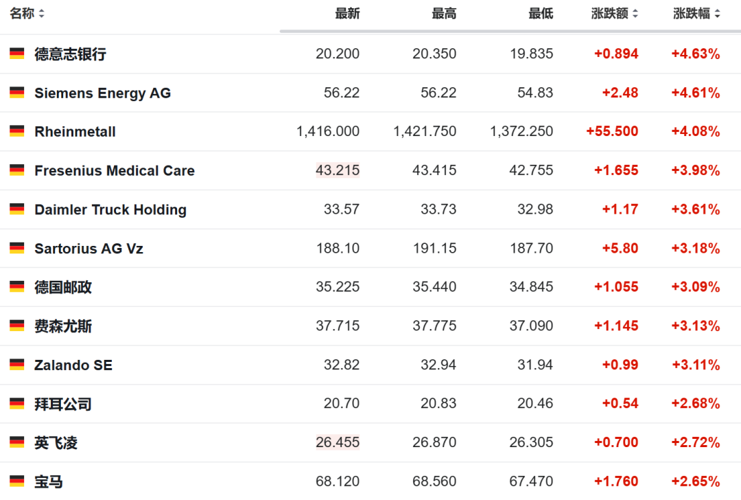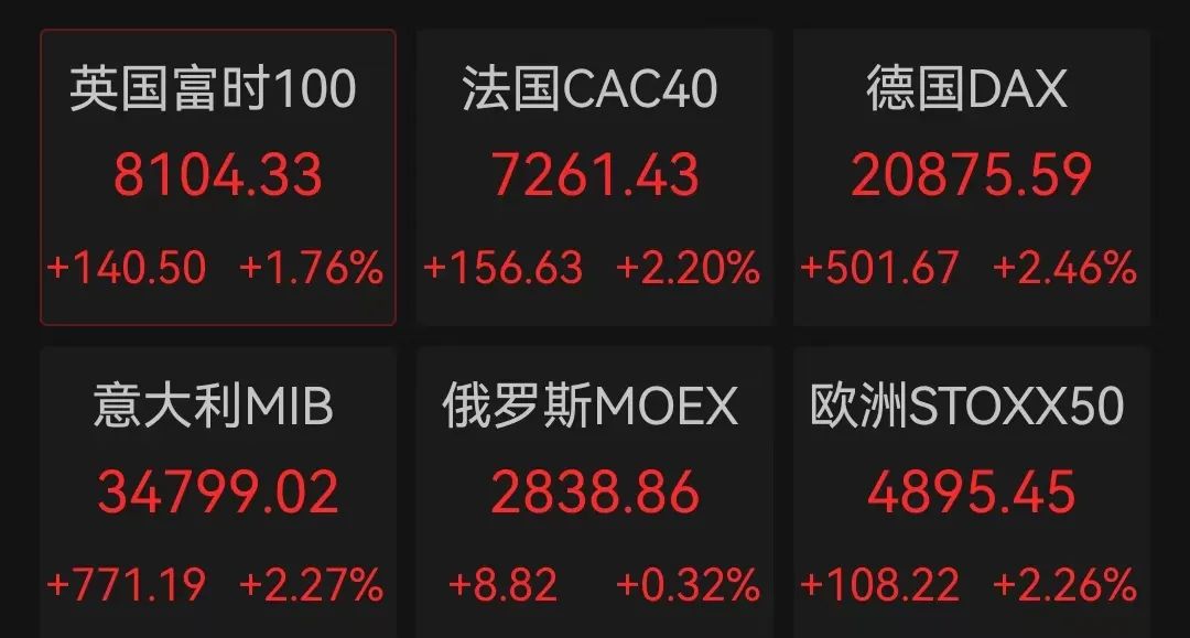 截至发稿,英国富时100指数涨1.76%,法国CAC40指数、德国DAX指数、意大利MIB指数均涨超2%。