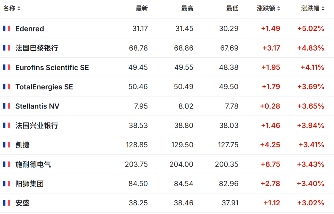 法国股市方面,法国巴黎银行、法国兴业银行涨幅靠前。
