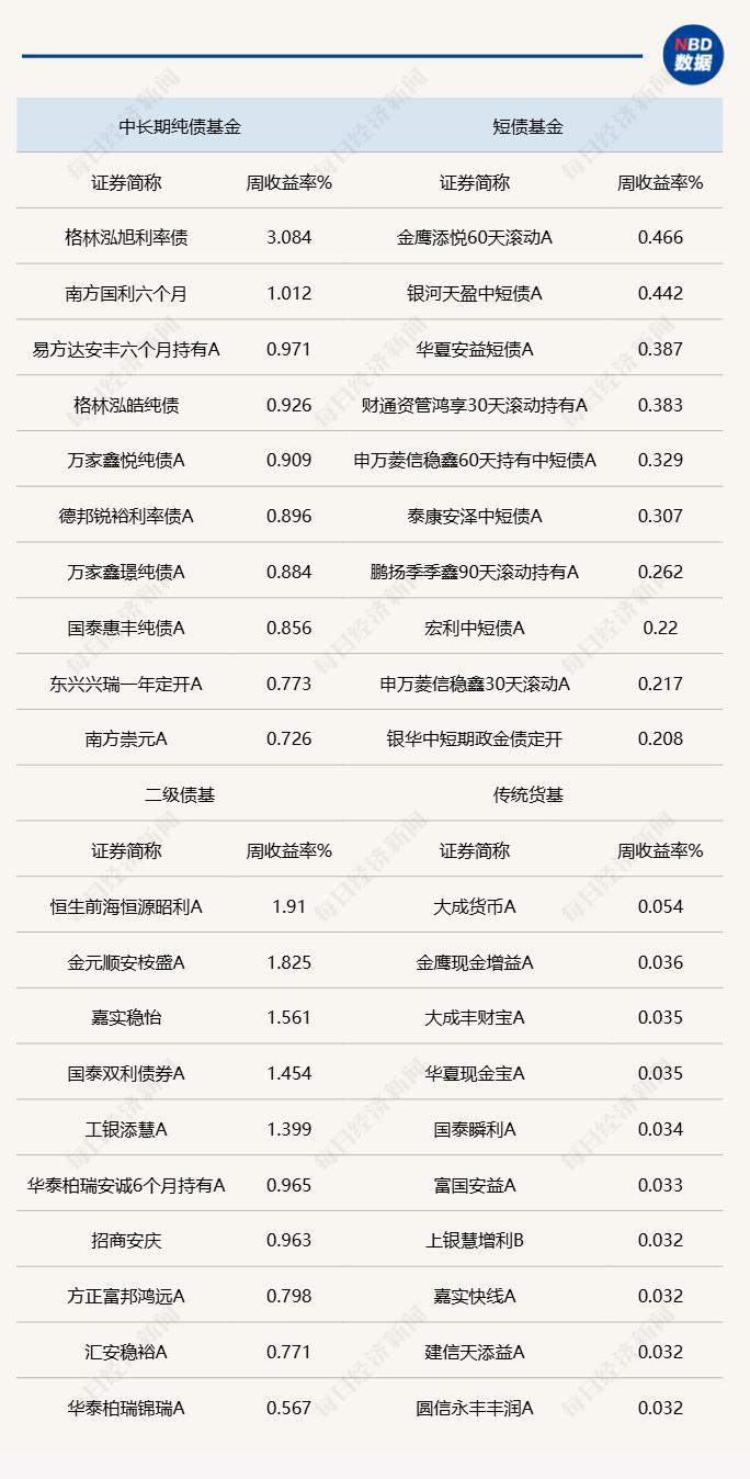 以中长期纯债基金为例,上周业绩最好的是格林泓旭利率债,周内收益率达到3.08%,但合煦智远欣悦利率债A则为-1.18%。后者在所有中长期纯债基金当中的单周收益率最低,短债基金当中,金鹰添悦60天A录得0.47%,但嘉实3个月理财A则录得-0.06%。