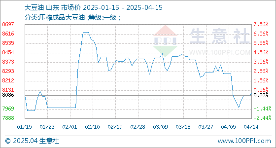 4月15日,生意社大豆油基准价为8102.00元/吨,与本月初(8342.00元/吨)相比,下降了-2.88%。