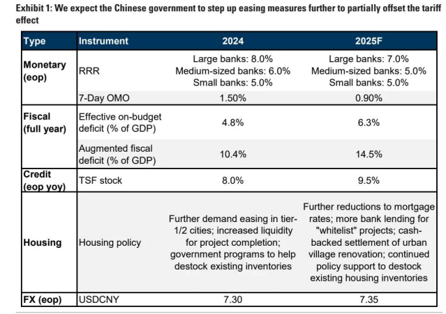 我们预计第二季度和第三季度将分别进行两次降准降息(降准 50 个基点,政策利率下调 20 个基点,第四季度再下调 20 个基点政策利率)。这意味着今年总共降准 100 个基点,政策利率下调 60 个基点(比我们之前对 2025 年的基线预测多下调 20 个基点政策利率,从 2026 年提前实施)。我们还预计中国人民银行将通过购买国债、直接开展逆回购和再贷款等方式,向银行体系注入更多长期流动性。货币政策宽松有助于配合正在进行的财政扩张,推动需求侧宽松措施的实施,并提振国内信心。