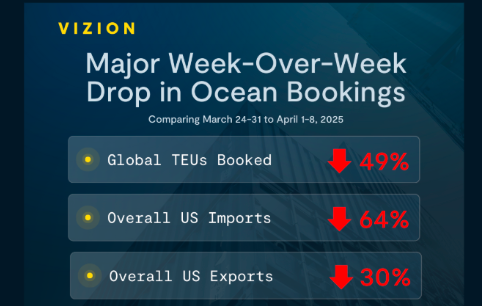 Vizion数据显示,4月1日至8日,全部的预订标准箱数量环比大幅下跌49%,美国整体进口数量环比大幅下跌64%。