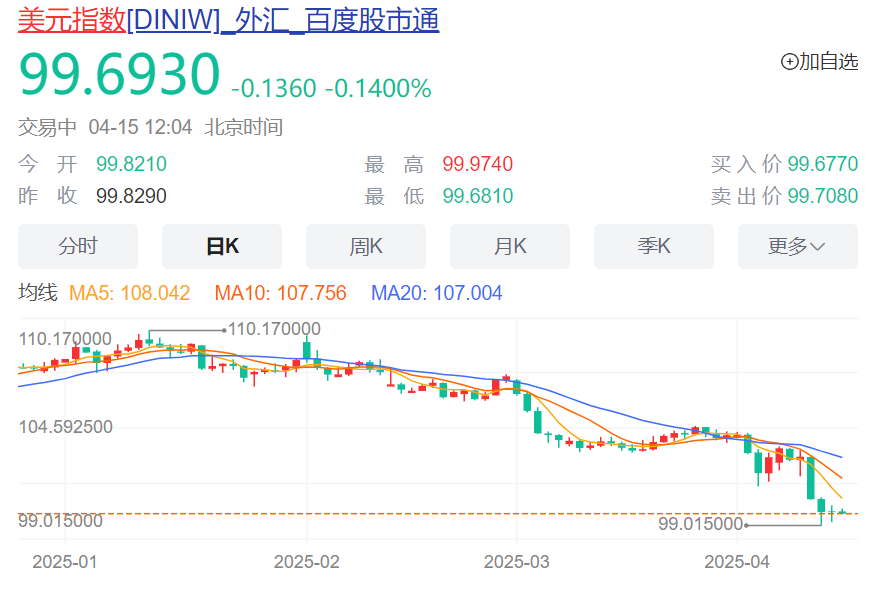 与此同时,美元指数连续下跌,11日跌破100大关后还在继续下行,截至发稿已跌破99.7。