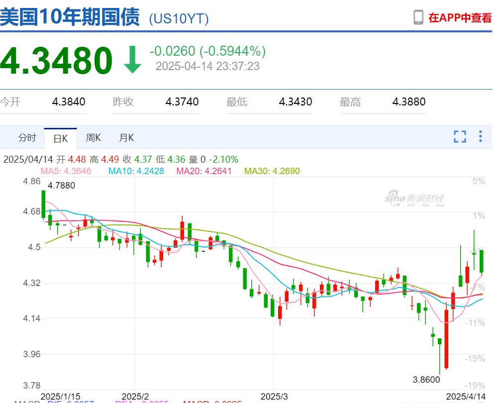 在美国周末宣布部分产品豁免“对等关税”后,本周,美国国债收益率有所回调。10年期国债收益率回落至约4.35%,30年期回落至4.77%。