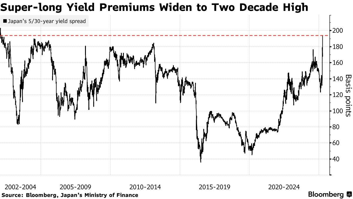 投资者要求持有日本30年期国债较5年期国债的溢价已扩大至逾20年来最高水平,原因是全球市场波动加剧和对日本财政状况的担忧推高了超长期日本国债收益率。根据计算,周一,两者之间的复合利差约为193个基点,为2002年5月以来最高。