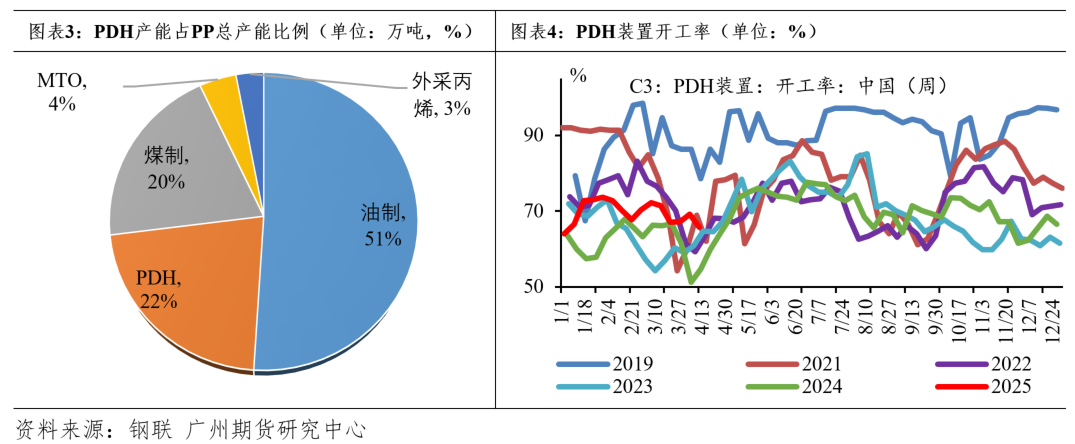 我国从美国进口PE、乙二醇占比17.23%、12.53%,乙烷制PE及乙二醇的产能占比为5.5%、10%,PDH装置占PP产能的比例也高达22%,截至2025年4月,中国PDH总产能达到2280万吨/年,其中PDH制PP产能在990万吨/年,占PP总产能的22%,是仅次于油制PP的第二大原料产品。国内PDH装置高度依赖美国进口丙烷原料,且丙烷都是签订长期合同,在PDH装置生产PP的工艺中,丙烷对于PDH的成本占比达到83%,是成本最大的影响因素。截至4.11,国内PDH开工已降至65.82%,预估国内PDH企业丙烷库存5月之后将出现缺口。