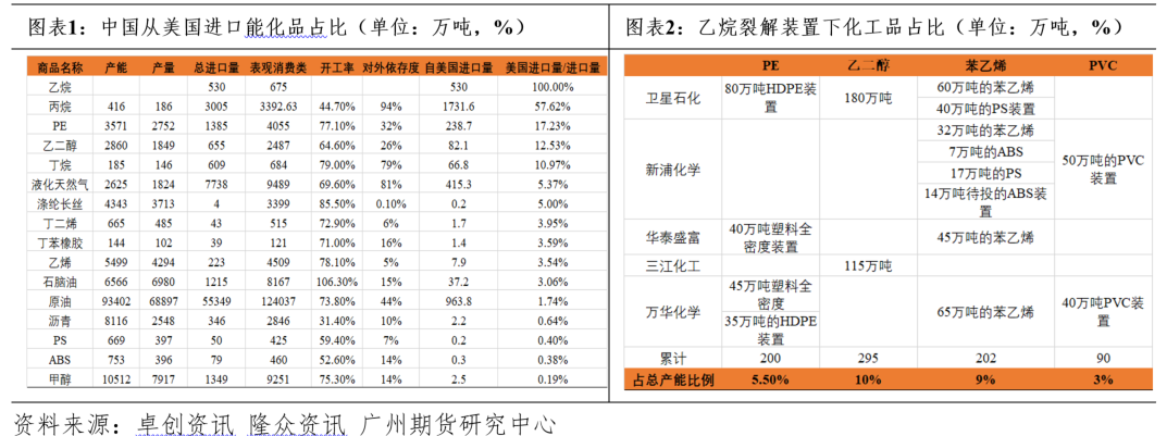 从下图可以看出,我国自美国进口的原料中乙烷、丙烷占比分别为100%、57.62%,中国的乙烷几乎全部是从美国进口,2024年我国丙烷产量近186万吨,而表需高达3392.63万吨,加征关税对于以气为原料的化工产品价格及供给影响较大。中国对美国实施的125%关税反制措施,将通过乙烷、丙烷进口成本的增加导致进口量下降,下游化工PE、乙二醇、苯乙烯、PP等产品的生产成本提高。