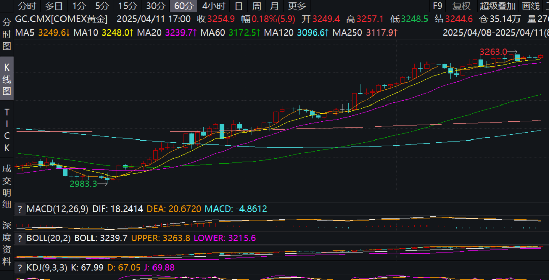 北京时间4月13日,纽约商业交易所(COMEX)黄金期货再度创出历史新高,主力6月合约盘中最高点达3263美元/盎司。截至记者发稿,该合约报收于3255美元/盎司。