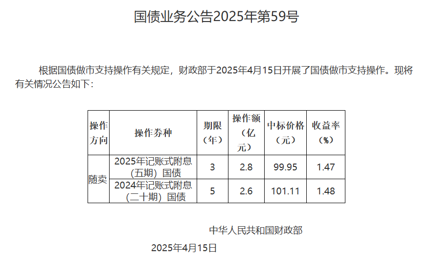 财政部于2025年4月15日开展了国债做市支持操作。操作方向为随卖,操作券种为2025年记账式附息(五期)国债,2024年记账式附息(二十期)国债。操作额分别为,2.8亿元、2.6亿元,期限分别为3年、5年。