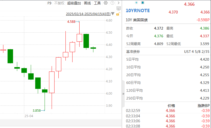 不过,随着近期美股、美元指数逐渐企稳,美债市场也企稳反弹。10年期美债收益率目前已下行至4.366%,30年期美债收益率下行至4.793%。