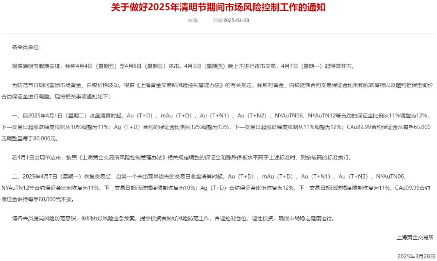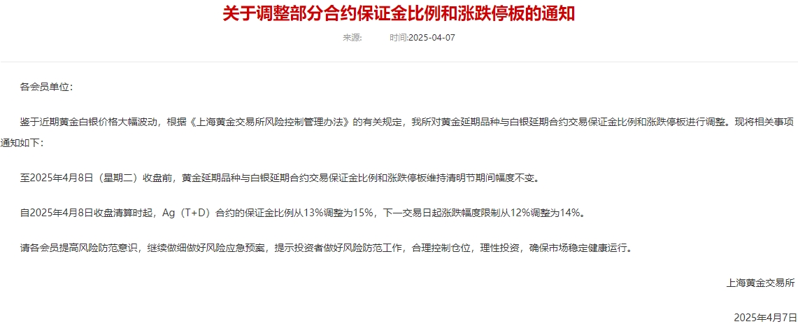 清明节期间,上海黄金交易所把黄金多个延期交收合约的保证金比例从11%上调到12%,把白银延期交收合约的保证金比例从12%调整为13%,节后又进一步把白银延期交收合约的保证金比例上调到15%。