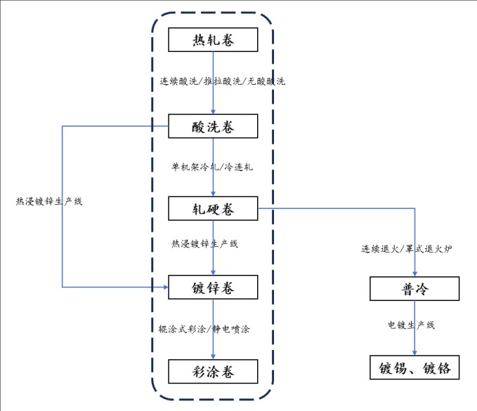 头部全流程加工企业,企业规模大、信誉好、执行能力强、产品质量高,具有品牌附加值,自有轧机6条,2024年产量147万吨,镀铝锌生产线2条,2024年产量47万吨,彩涂生产线1条,2024年产量16万吨。有独立的外贸销售团队。每月热卷用量约12万吨,协议量约4万吨,其余市场采购。总库存8-10万吨,1万吨常备库存。轧硬九成内销,销售区域在博兴周边,月出口量1-1.5万吨,轧硬按照冷轧名目出口;镀铝锌九成以上出口,彩涂七成出口,三成内销主要用于国内工程类项目。主要出口市场为巴西、东南亚的马来、印尼、泰国、菲律宾等一些国家,彩涂主要出口中东国家,近两年东南亚地区的销售增量较多,今年出口接单同比明显好转,出口量增加12%。