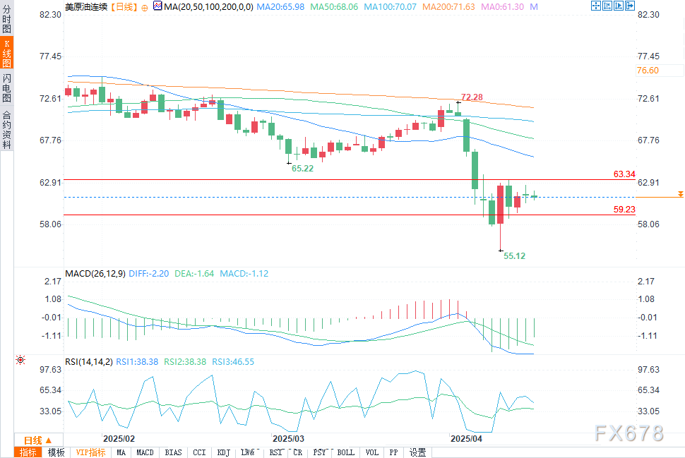 汇通财经APP讯——周二(4月15日)欧盘时段,WTI原油期货价格小幅走跌,在关键技术价位之间维持窄幅波动。交易员们在等待一个决定性的走势:要么突破63.34美元的阻力位,这可能引发对50日和200日移动平均线(分别为68.05美元和71.63美元)的测试;要么跌破59.23美元的支撑位,从而打开重新测试近期低点55.12美元的大门。