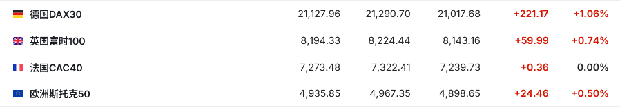 2. 截至发稿,德国DAX指数涨1.06%,英国富时100指数涨0.74%,法国CAC40指数涨0.00%,欧洲斯托克50指数涨0.50%。