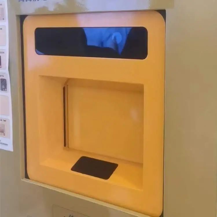 “黄金ATM机”外观为金灿灿的黄色,两端的柜体上方的灯箱,分别标注着“智能黄金回收”和“自助黄金购买”字样。两端柜体由中间的圆筒状装饰件连接,装饰件上方的灯箱标注有“智慧金店”5个大字,以及设备研制单位等信息。