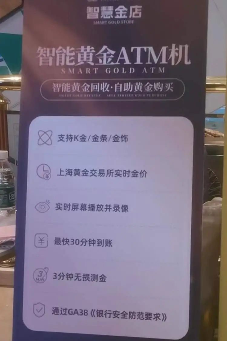 据悉,“黄金ATM机”的研制方是深圳某企业。该集团企业公开的信息显示,集团成立于2006年,深耕黄金珠宝产业链,连续六届荣获“中国企业500强”,连续七届荣获“中国民营企业500强”,是200家银行准入供应商和合作伙伴。记者注意到,“黄金ATM机”旁白的告示牌上,相关介绍内容中有这么一行字:通过GA38《银行安全防范要求》。