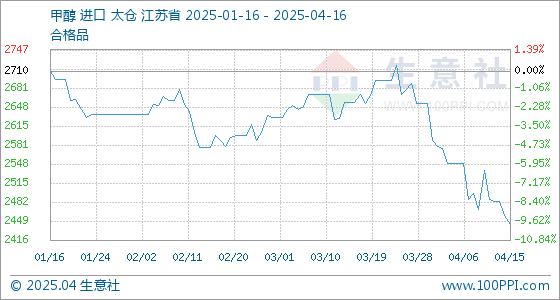 4月16日,生意社甲醇基准价为2443.75元/吨,与本月初(2590.00元/吨)相比,下降了-5.65%。
