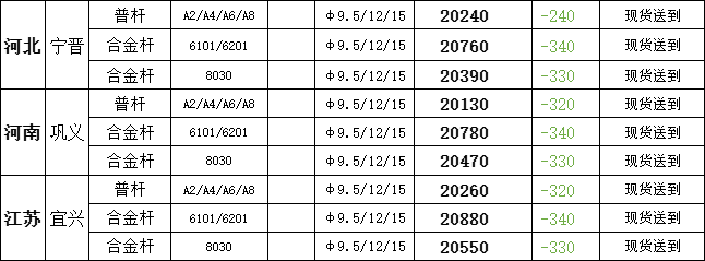 4月9日宁晋市场普铝杆现货报盘价20240元/吨,较上一交易日报价跌240元/吨;巩义市场普铝杆现货报盘价20130元/吨,较上一交易日报价跌320元/吨;宜兴市场普铝杆报盘价20260元/吨,较上一交易日报价跌320元/吨。