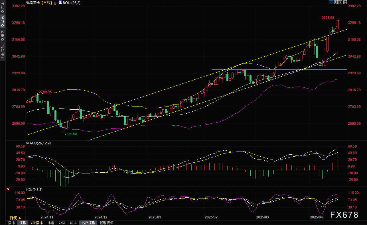 汇通财经APP讯——国际金价周三(4月16日)亚洲时段再度刷新历史纪录高点,现货黄金价格盘中暴涨1.93%,触及每盎司3291.68美元的惊人高位,距离突破3300美元大关仅一步之遥。这一历史性突破背后,是美元持续疲软、贸易战阴云密布以及全球经济前景黯淡三大因素共同作用的结果。