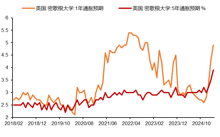 虽然2月通胀不及预期暂时缓解了市场通胀忧虑,但波动较大的运输服务是通胀降温的主要原因。另外,美国通胀预期抬升大幅抬升,2月密歇根消费者1年通胀预期升至4.3%,上行1个百分点,创2023年11月以来新高,而5年通胀预期升至3.5%,长期通胀预期抬升这对美联储来说非常不利。密歇根大学的消费者通胀预期指标是美联储重点关注的指标之一,如果密歇根大学的消费者通胀预期指标稳定在一定水平,美联储通常还可以观望更多的经济数据,但指标一旦启动走高,就意味着美联储需要警惕,很可能是加息的信号。根据密歇根大学调查,通胀预期指标的飙升,主要由于消费者担心美国政策将推高通胀。