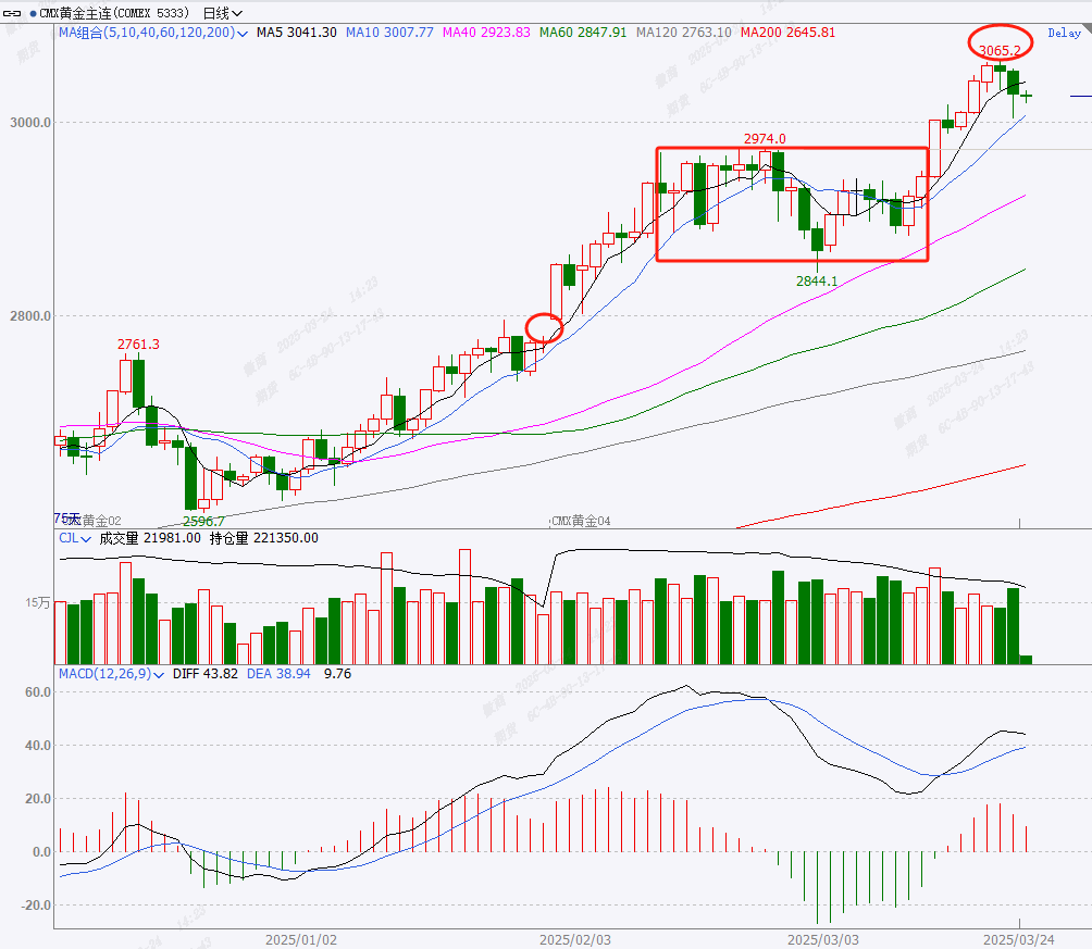3月份以来,特朗普关税言论再度扰动市场,叠加美国2月CPI报告全面降温,美联储降息预期升温,带动金价突破2月中旬以来的横盘震荡整理区间,并不断创历史新高,于3月20日最高触及3065.2美元/盎司,之后价格高位震荡。内盘贵金属跟随外盘走势,沪金于3月21日触及711.24元/克,创历史新高。截至2025年3月27日,CMX黄金季线收涨15.07%,CMX白银季线收涨17.28%。沪金主连季线收涨15.01%,沪银主连季线收涨12.07%。