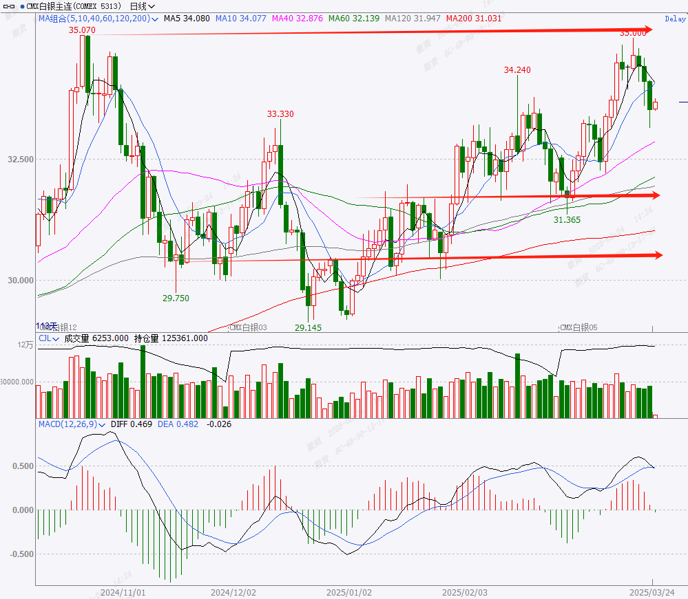 2025年开年以来,由于美国经济走弱,通胀放缓,美联储重启降息预期升温,叠加关税政策反复以及地缘局势混乱等因素影响,黄金不断创出历史新高,其中CMX黄金最高触及3065.2美元/盎司,白银避险属性不及黄金,同时受制于工业属性影响,CMX最高触及35美元/盎司,但并未突破前高。截至2025年3月27日,CMX黄金季线收涨15.07%,CMX白银季线收涨17.28%。