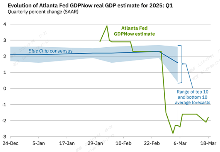 尽管特朗普及其内阁官员多次强调政策冲击使得美国经济处于“过渡期”,但通胀高企使美国居民消费转向谨慎,就业市场放缓,美国经济出现衰退的风险正在上升。亚特兰大联储GDPNow模型最新预计美国第一季度GDP从前期的增长2.3%调整至-1.8%,美国3月的制造业PMI指数再度重回萎缩区间,虽然服务业好于预期,但服务业前景恶化,对未来一年的信心下滑至2022年以来的第二低点,市场的担忧难以消退。