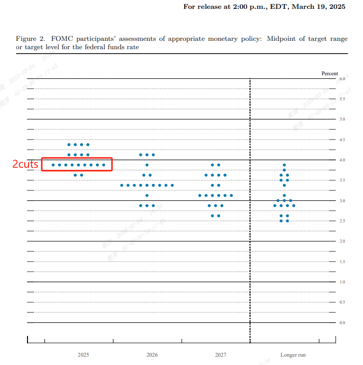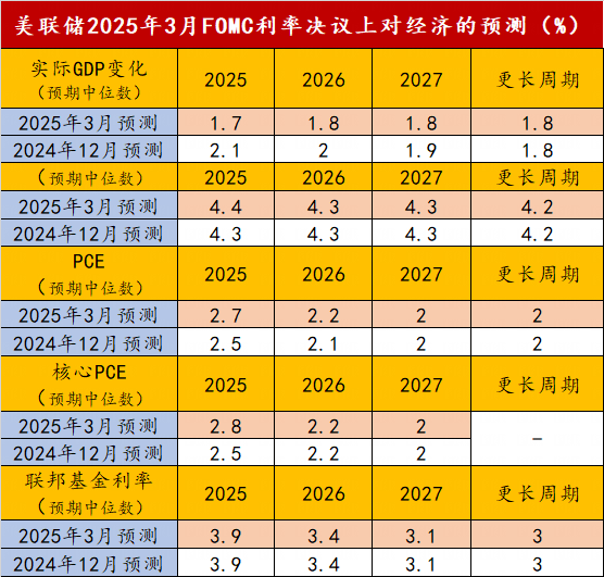官员们下调经济增长预测,将2025年的GDP预期由前值2.1%下修至1.7%。通胀方面,将2025年的PCE预测由2.5%上修至2.7%,核心PCE通胀率从2.5%上调至2.8%。就业方面,2025年失业率小幅上修至4.3%,前值为4.2%。同时点阵图显示,美联储2025年将利率维持在3.9%,与2024年12月预测一致,这意味着2025年美联储将会降息两次。